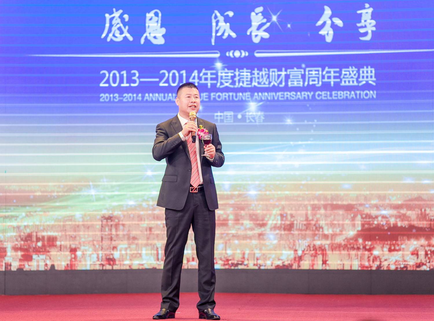 在这个艳阳高照的日子里,捷越财富在吉林长春隆重举办了以“感恩、成长、分享”为主题的“2013-2014年度捷越财富周年盛典”活动,捷越北区财富中心员工、长春地区高端客户及优秀理财经理共三百多人欢聚一堂,共同分享这一值得纪念的历史时刻。北京捷越总部风控部总监王晓婷、产品及运营部总监袁成龙、总裁秘书毛奇浩等一行代表捷越总部郑重出席了盛典活动,共同见证了北区财富中心周年盛典这一盛大时刻。