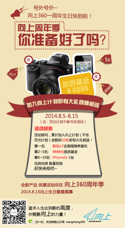 8月5日至8月14日期间,加入“向上计划”金额排名前十位即可获得索尼微单、携程8888元旅游礼品卡、iPhone5s等各种超值大礼,参与活动的向上计划包括:网页端向上计划(90天、365天,低门槛,1000元即可加入);手机专属向上计划(90天、180天、365天)。