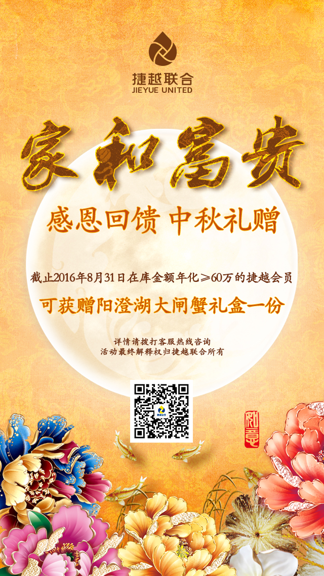 2016中秋佳节到来之际,为了回馈捷越会员长久以来的支持,乐鱼web版登录入口客户服务中心特举办“家·和·富·贵”2016捷越会员中秋礼赠活动。截止2016年8月31日在库金额年化≥60万的会员即可获赠价值888元的阳澄湖大闸蟹礼盒一份!