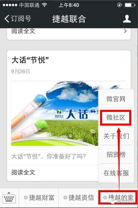 2、聊天框输入“微社区”,在弹出的图文消息中,点击链接进入微社区;或者点击屏幕下方“捷越的家”,找到“微社区”菜单进入,发送图文参与互动。