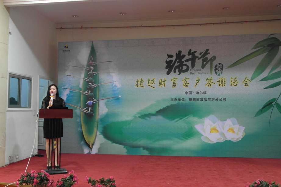 为回馈广大客户一直以来对捷越财富哈尔滨分公司的大力支持,5月25日,捷越北区财富中心哈尔滨营业一部,在哈尔滨银河大酒店彗星厅隆重举行“捷越财富哈尔滨分公司端午节客户答谢酒会”,共有近二百位嘉宾出席。