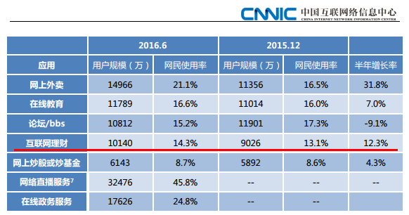 截至2016年6月,我国购买互联网理财产品的网民规模达到1.01亿,较2015年底增加用户1113万人,网民使用率为14.3%,较2015年底增加1.3个百分点。